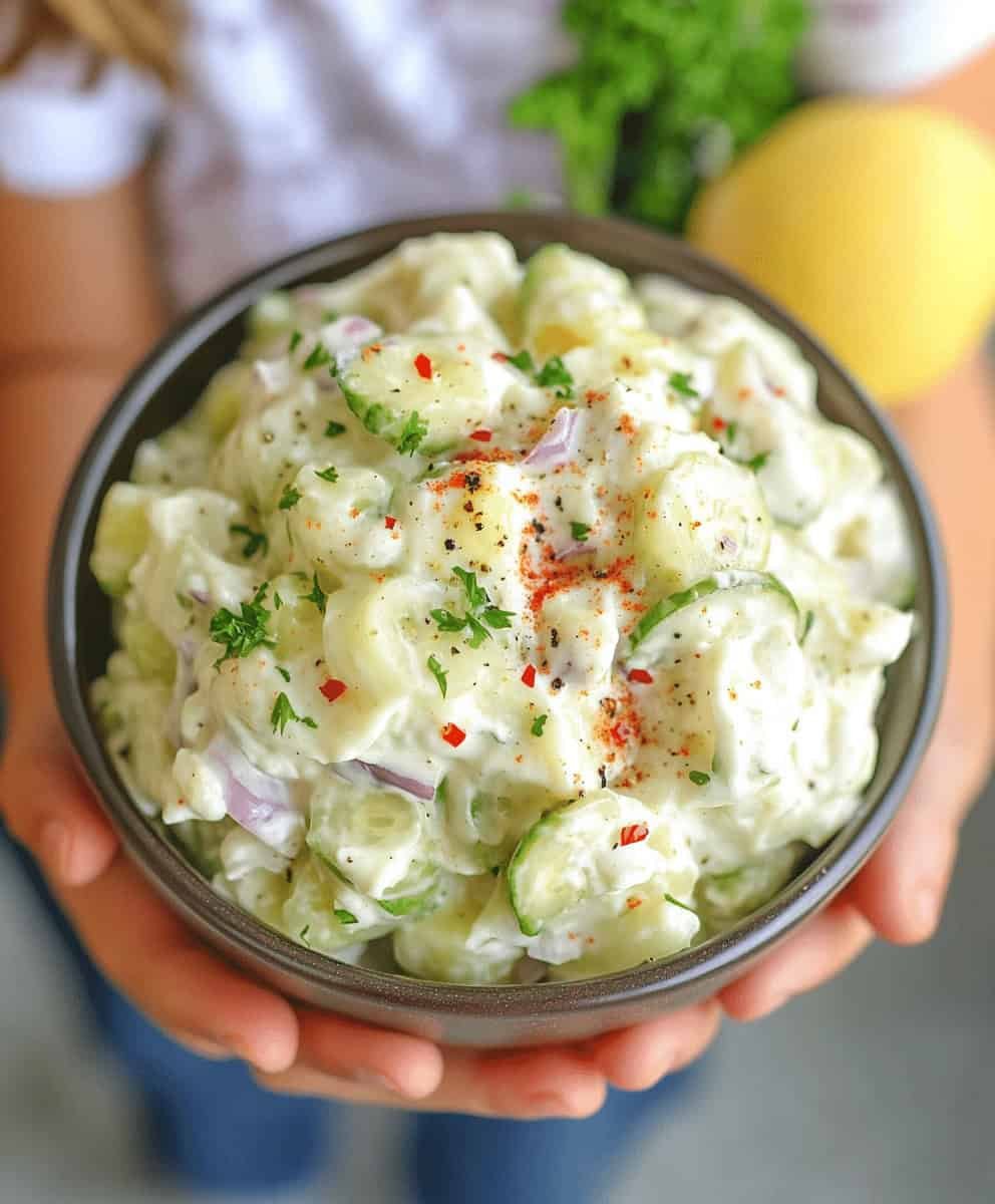Chop: Try to dice the cucumber, peppers, and onions into uniform sizes so you get a bit of everything in every spoonful.