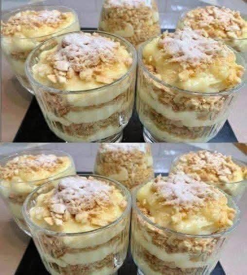 1. Prepare the Base: In a small bowl, mix the crushed biscuits with the melted butter until the mixture feels like wet sand. Spoon about 2 tablespoons into the bottom of each glass. Press down lightly with the back of a spoon to create an even layer.