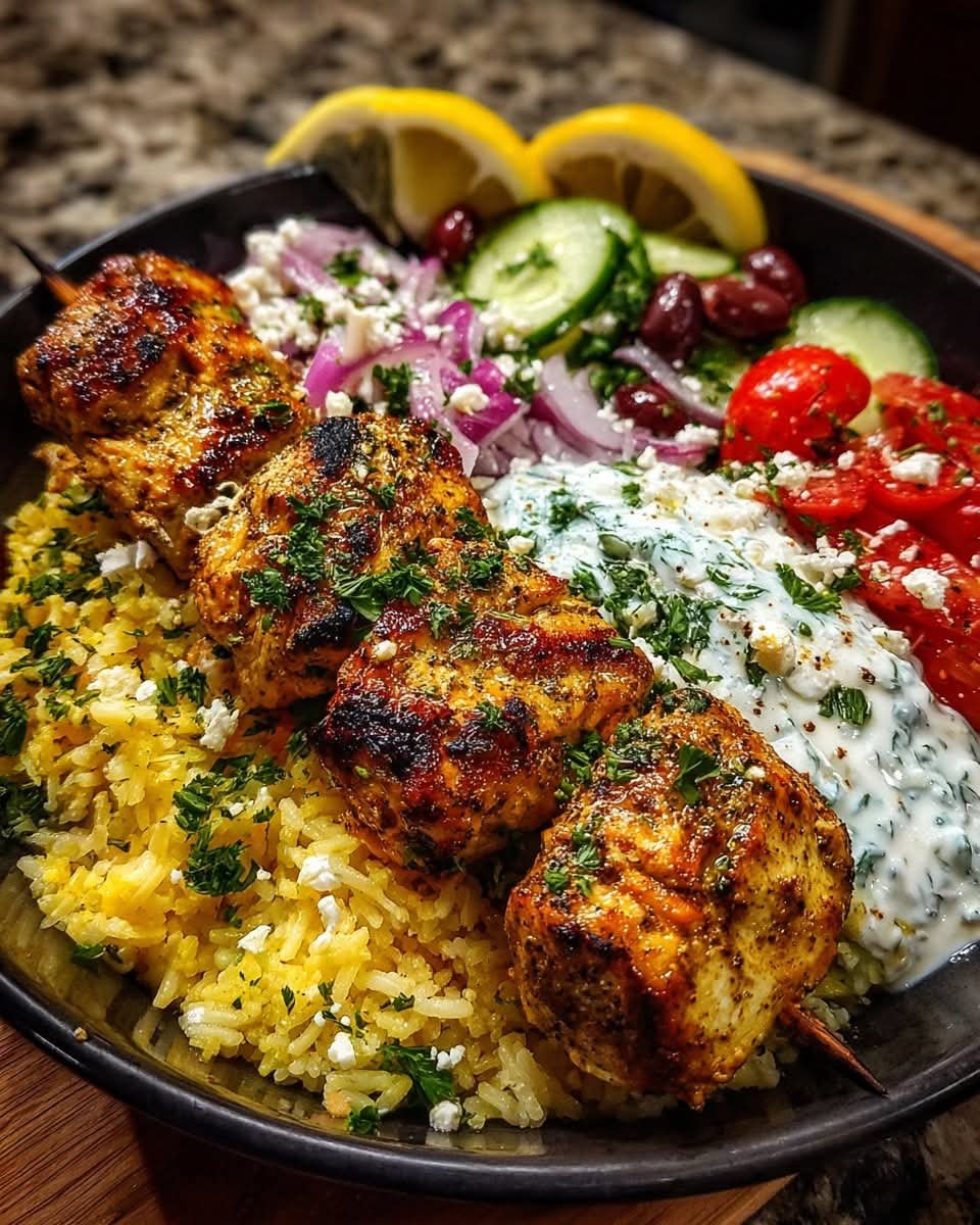 Assemble the bowls: add a base of rice or quinoa, then top with grilled chicken, tomatoes, cucumber, red onion, olives, and feta cheese.