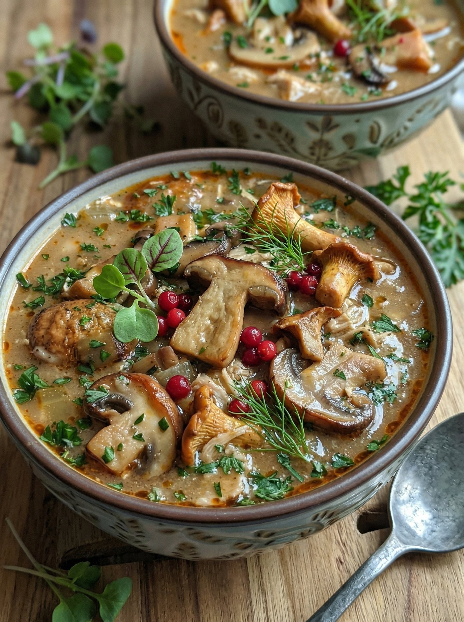Hearty and comforting soup made with tender chicken, earthy mushrooms, and a rich, savory broth!