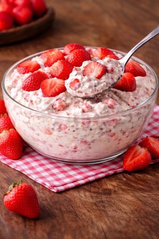 5. Chill & Serve: For the best consistency, let the bowl chill in the refrigerator for at least 30 minutes. This allows the pudding mix to fully set. Top with fresh strawberry slices before serving.