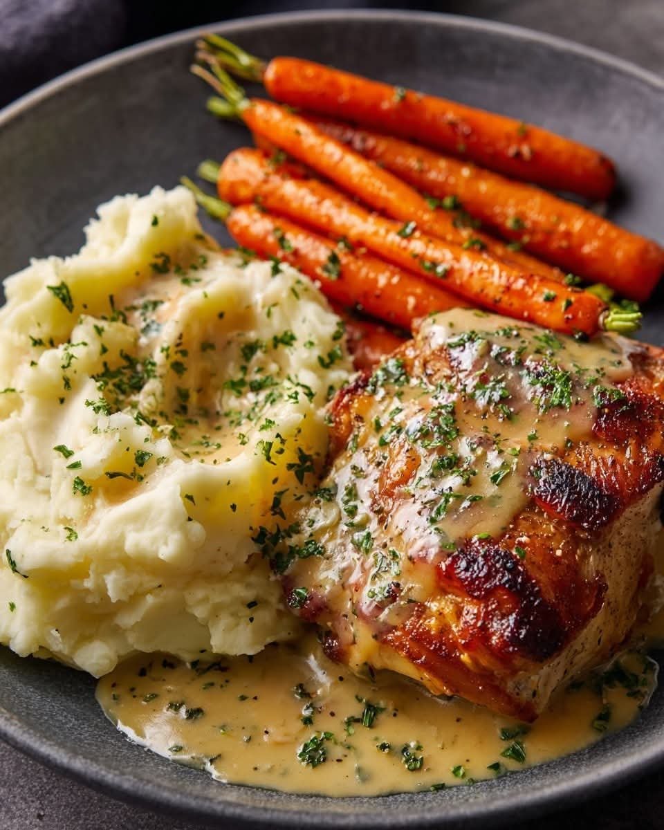 πŸ₯” Herb Chicken Thighs with Gravy, Buttery Mashed Potatoes & Roasted Carrots πŸ₯•πŸ—