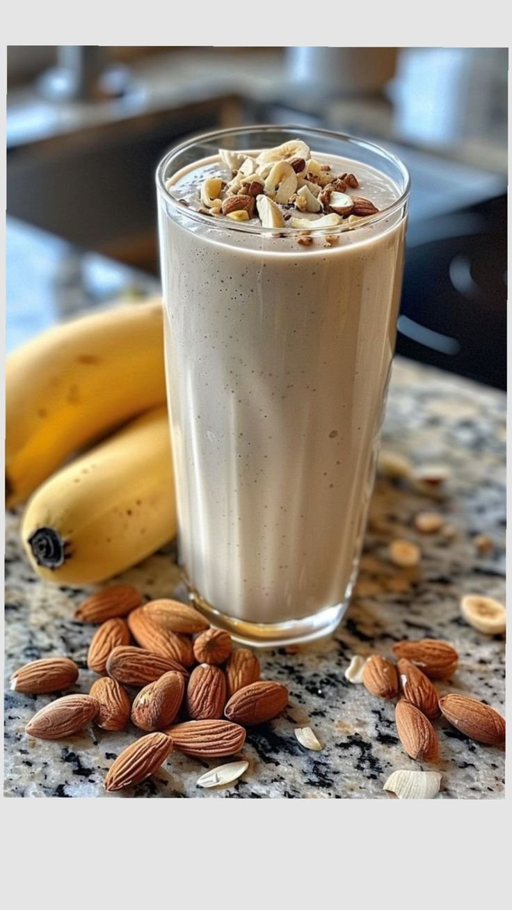 Garnish: Pour into a tall glass. Top with the almonds and banana slices to match the beautiful presentation in your picture.