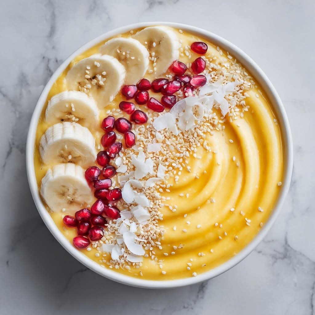 A thick, creamy mango smoothie bowl topped with banana, pomegranate, coconut, and sesame seeds β refreshing, nourishing, and perfect for breakfast! π