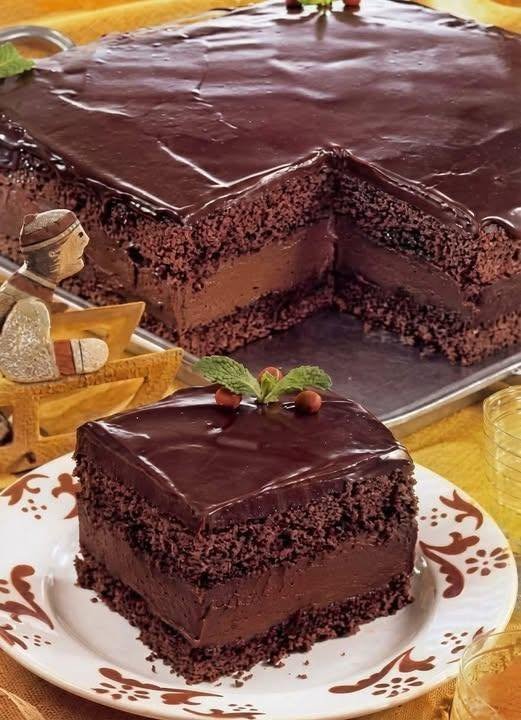 Prepare the chocolate cake mix according to the package instructions in a square or rectangular baking pan.