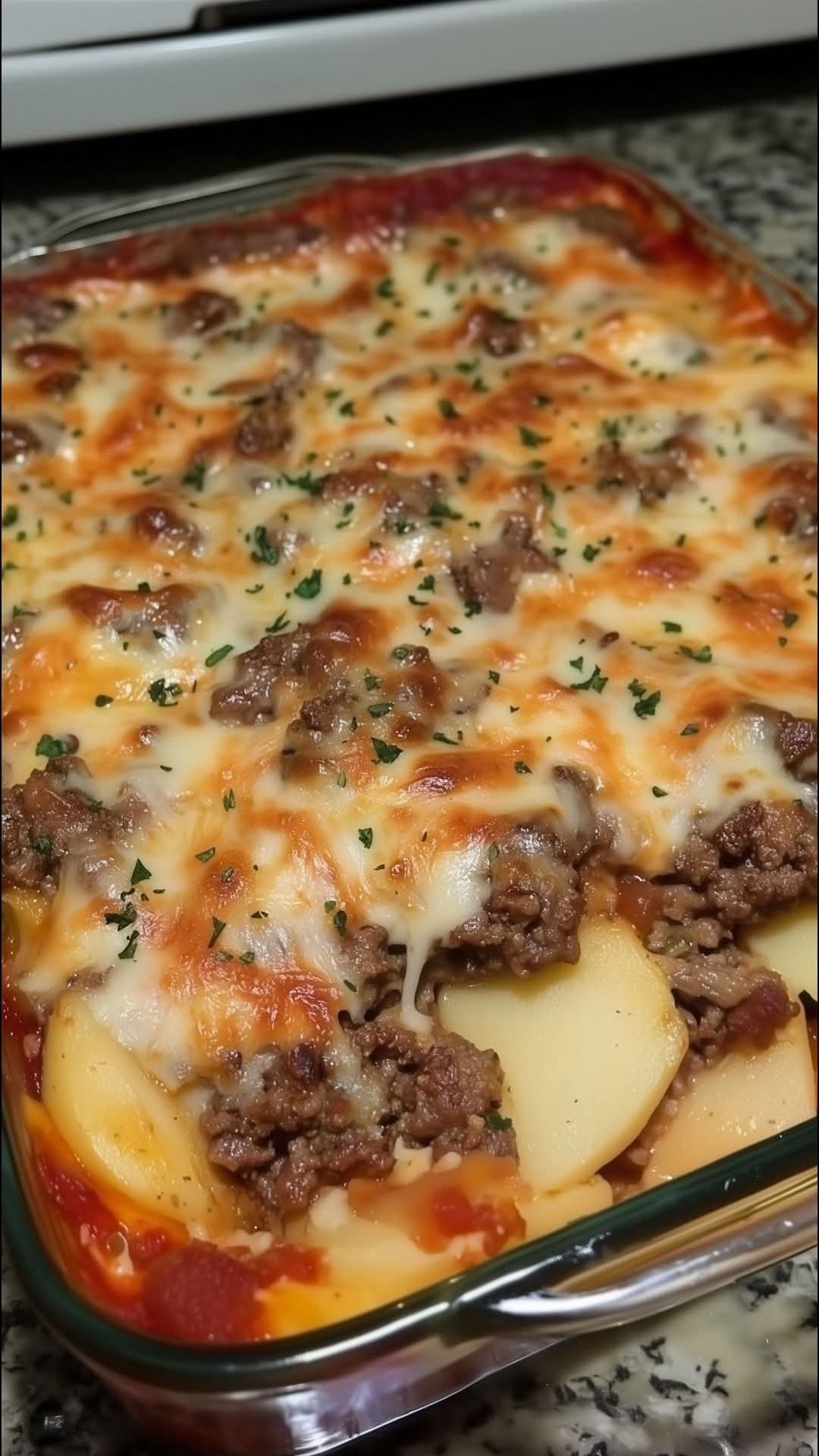 Construct a second layer by arranging the remaining tubers, then covering them with another one-third portion of the soup mixture and the remainder of the meat mixture.