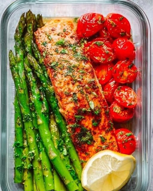 Baked Salmon with Asparagus and Roasted Tomatoes
