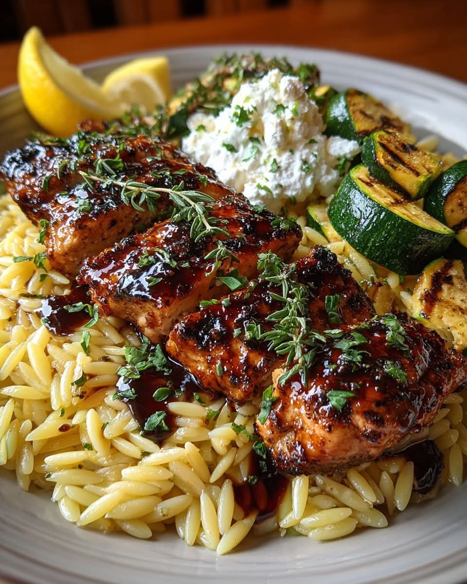 Balsamic Glazed Chicken & Orzo with Whipped Feta & Grilled Zucchini