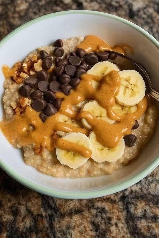 A warm and creamy bowl of oats topped with sliced bananas, smooth peanut butter, crunchy walnuts, and melty chocolate chips.