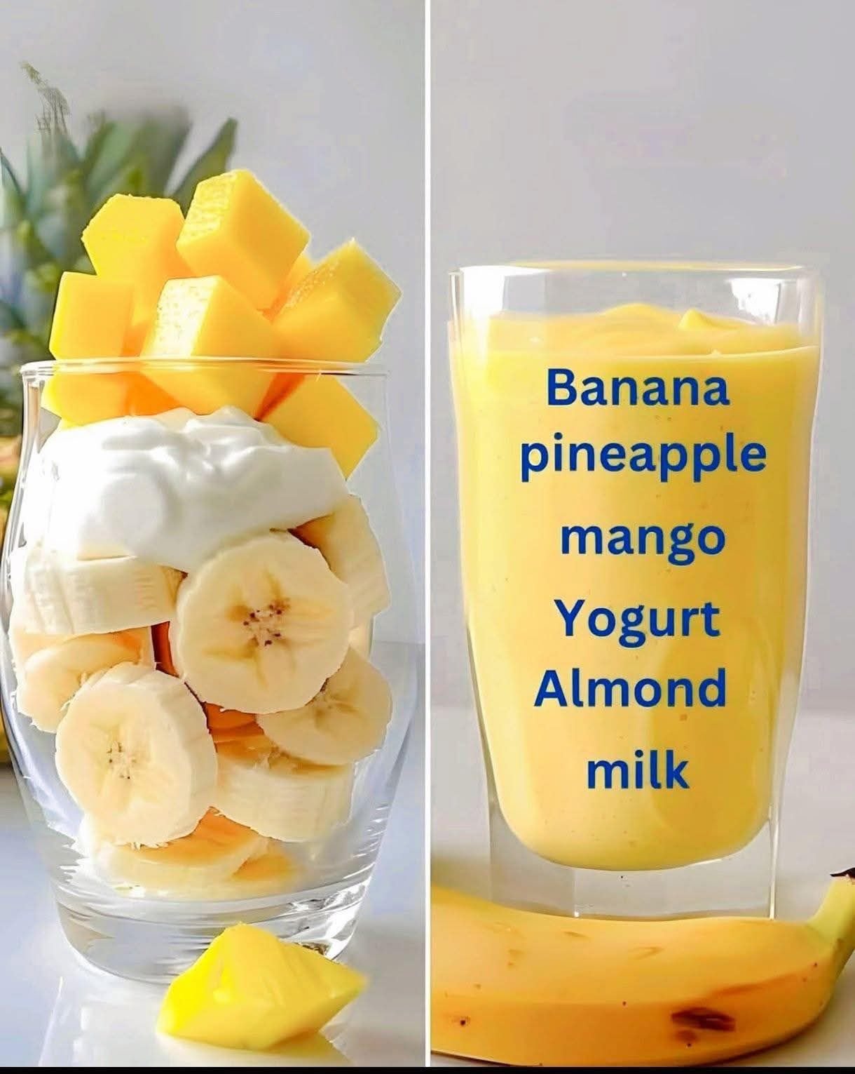 This smoothie has a naturally sweet, tropical flavor. The banana adds creaminess, mango provides rich sweetness, pineapple gives a light tang, and yogurt balances everything with a mild, creamy texture. Almond milk keeps it light and dairy-free-friendly.