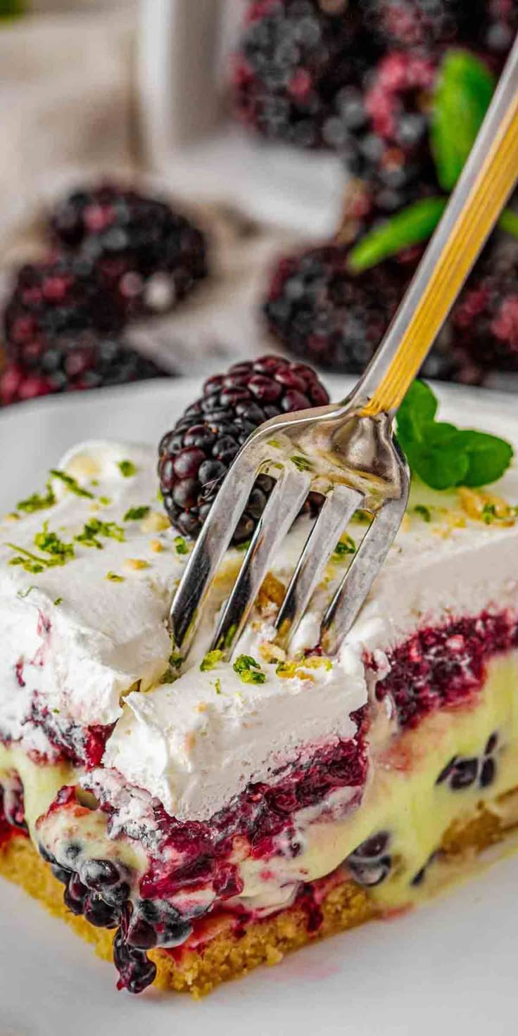 Slice into squares and serve cold. Add a fresh blackberry, mint leaf, and extra lime zest on top for a bakery-style finish.