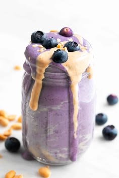 5. Serve: Pour the smoothie into the jar. Top with a handful of fresh blueberries, the remaining tablespoon of peanut butter, and a few crushed peanuts for crunch.