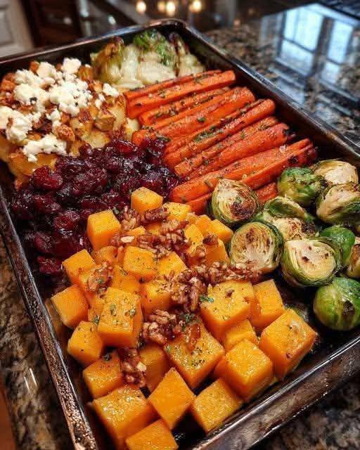 5. Finish: Remove from the oven. While still hot, sprinkle the dried cranberries, nuts, and feta over the top. The residual heat will slightly soften the cheese and plump the berries.