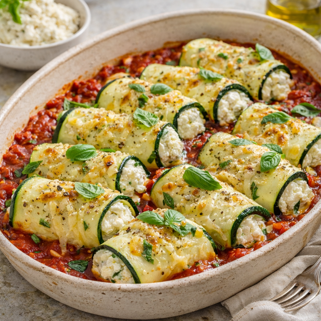 Zucchini Cannelloni with Ricotta is a light, low-carb twist on classic Italian cannelloni. Instead of pasta tubes, thin slices of zucchini are rolled around a creamy ricotta filling, then baked in a rich tomato sauce and topped with melted cheese. It’s fresh, comforting, and perfect for a healthy yet satisfying meal.