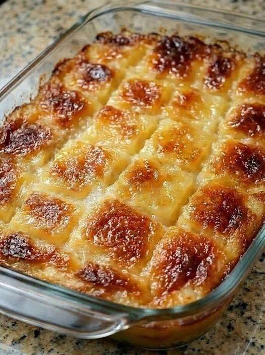 A rich, baked potato dish layered with cream, cheese, and seasonings, baked until golden and bubbling.