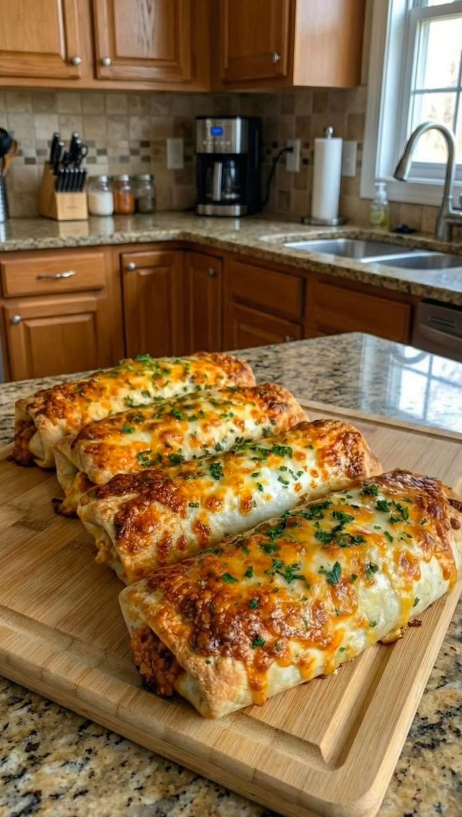 Baked dough sticks filled with seasoned ground beef and melted cheese, brushed with garlic butter and served with dipping sauces.