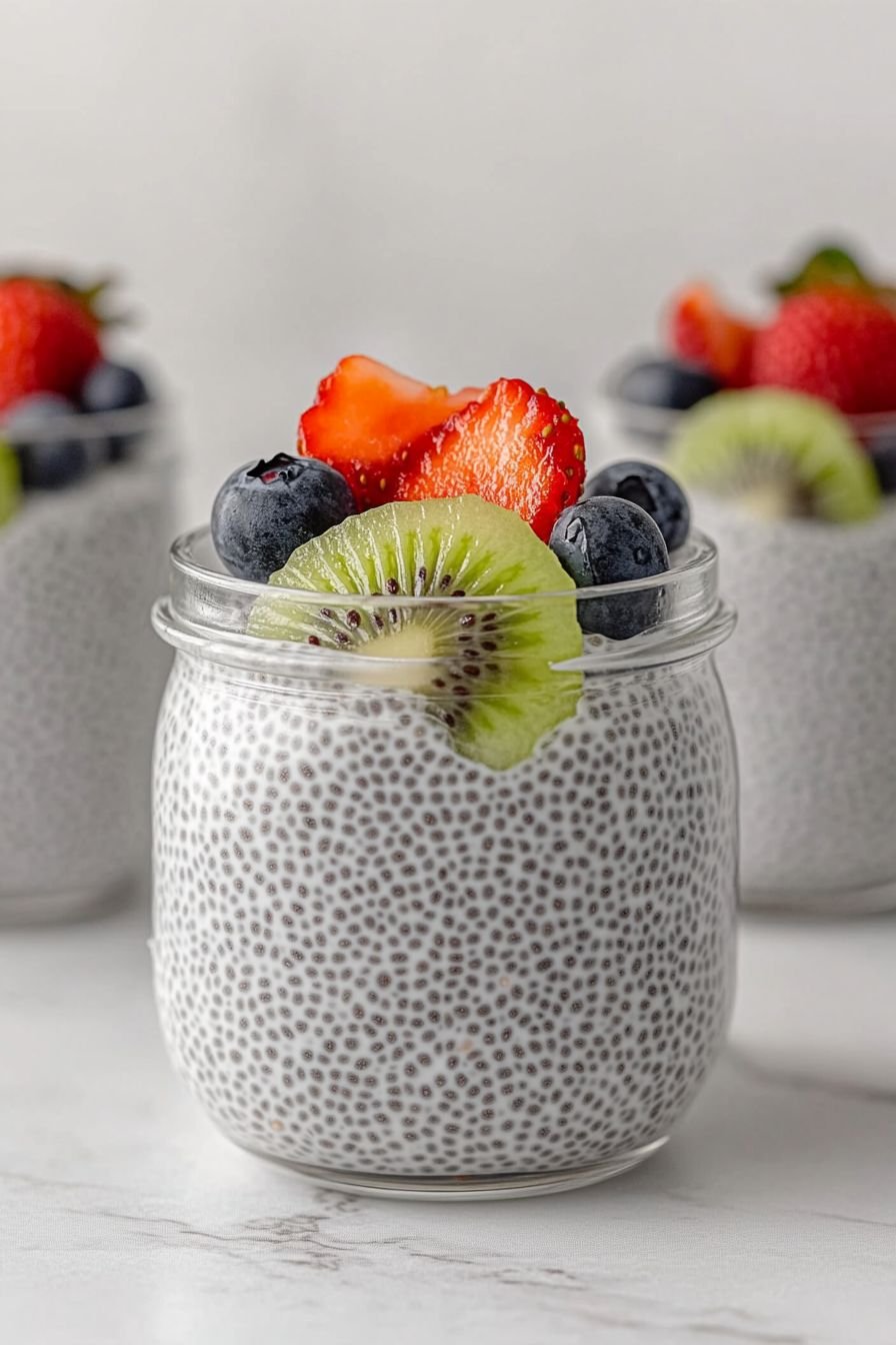 Serve: Once set, stir the pudding once more. Top with fresh, vibrant fruits like sliced kiwi, strawberries, and blueberries before serving.