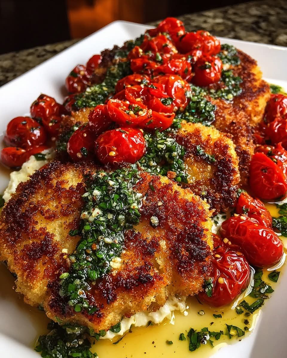 Chicken Milanese with Whipped Feta, Roasted Tomatoes & Garlic Basil Oil