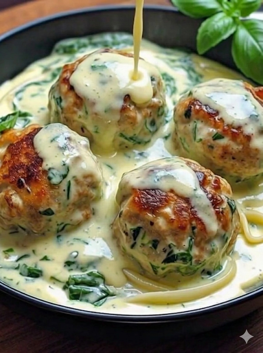 Return the meatballs to the skillet and coat them in the spinach Alfredo sauce. Simmer for a few minutes so the flavors combine. Serve warm over pasta or rice and enjoy this rich, comforting meal. 🌿🍝