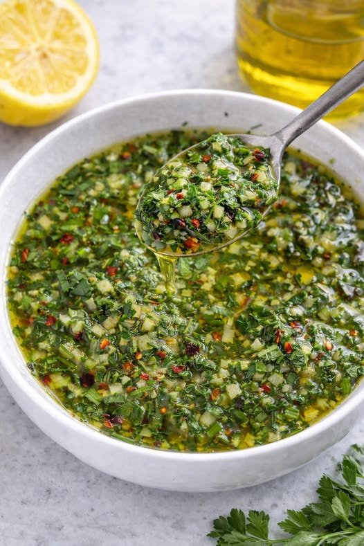 Chimichurri is a fresh, herb-packed sauce from Argentina made with parsley, garlic, olive oil, and vinegar. It’s bold, zesty, and perfect for grilled meat, chicken, veggies, or even bread.