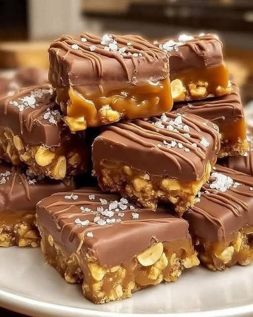 Let the caramel cool for about 5–10 minutes, then pour it evenly over the peanut base. Return the pan to the refrigerator for at least 30 minutes.