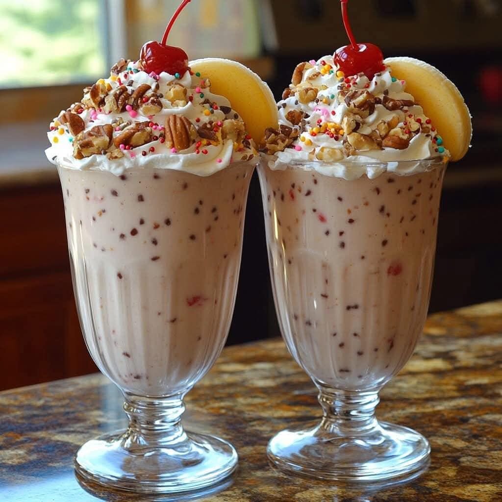 This Creamy Banana Nut Milkshake Delight is a classic, joyful treat that brings together smooth bananas, rich ice cream, crunchy nuts, and festive toppings. It is perfect for warm afternoons, special gatherings, or anytime you want something comforting and refreshing. The texture is thick and creamy, while the flavors are naturally sweet and balanced. This recipe is simple to prepare at home and looks beautiful when served in tall glasses like the ones shown in the image.