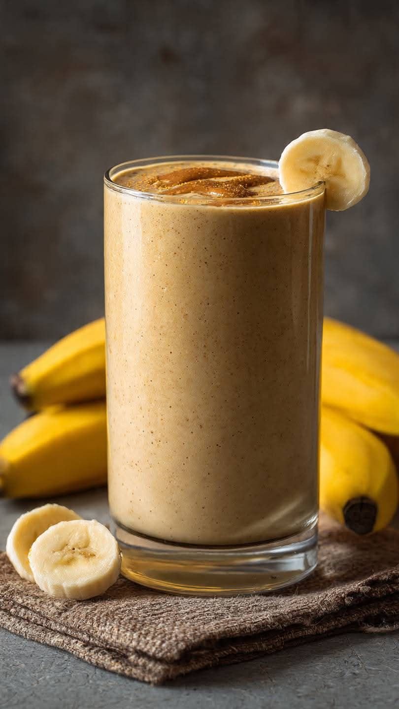 Garnish: Pour into a tall glass. Drizzle a small amount of melted peanut butter on top, sprinkle with extra cinnamon, and finish with a fresh banana slice on the rim, just like in the photo.