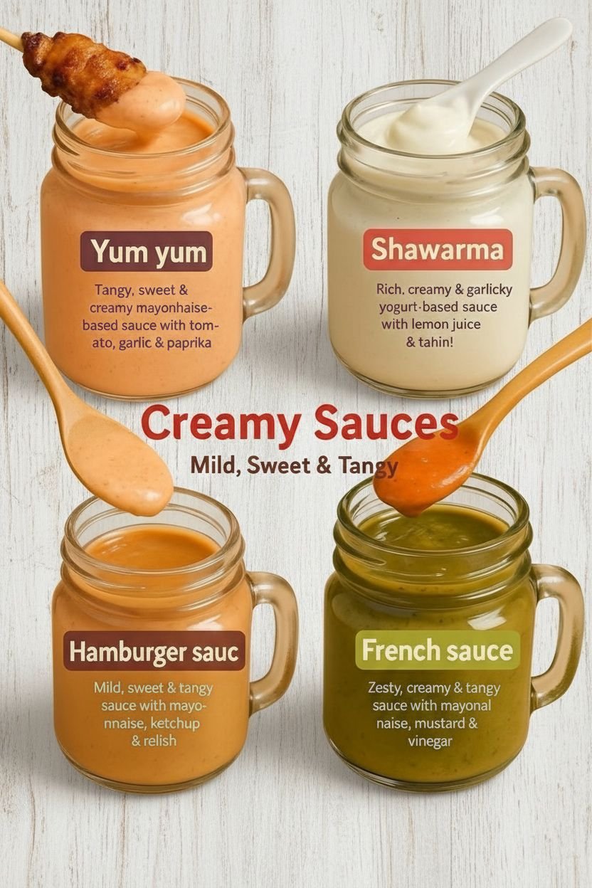 These four smooth and flavorful sauces are inspired by popular restaurant-style dips. They are mild, sweet, tangy, and creamy—perfect for burgers, fries, wraps, and grilled foods.