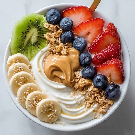 Arrange banana, kiwi, strawberries, and blueberries on top.