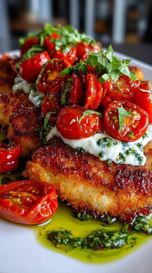 Here’s a flavorful, restaurant-style recipe for Crispy Chicken Cutlets with Whipped Feta, Roasted Tomatoes, and Basil Oil—crunchy, creamy, and fresh all in one plate.