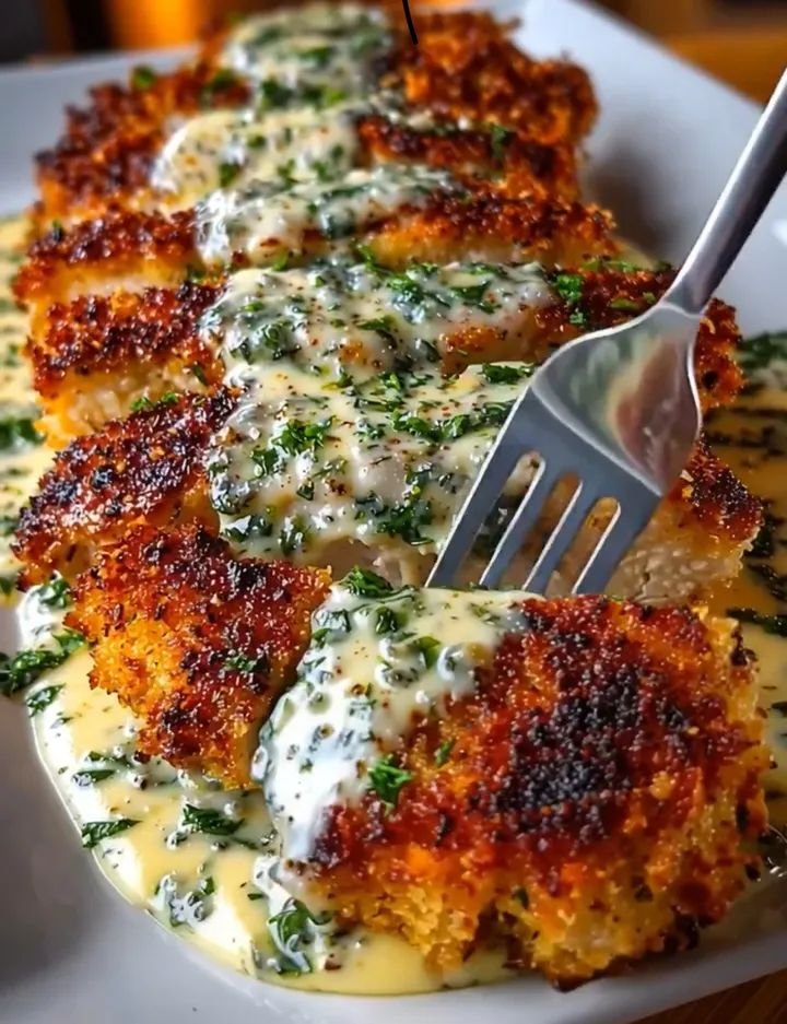 Crispy Parmesan Crusted Chicken with Creamy Garlic Sauce
