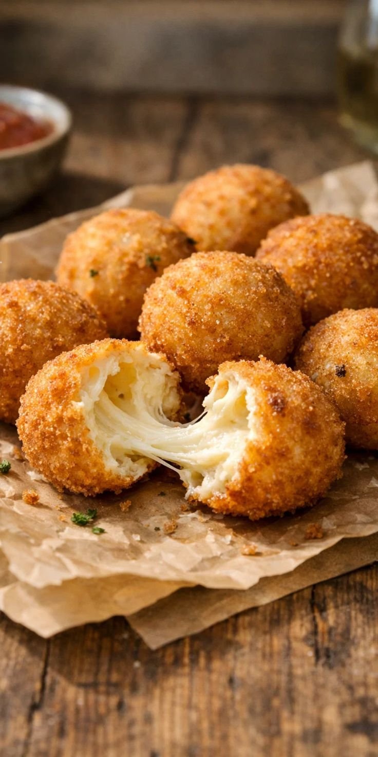 Form the Balls: Scoop about 2 tablespoons of the rice mixture into your palm. Flatten it slightly, place a mozzarella cube in the center, and fold the rice around it to create a smooth, tight ball about the size of a golf ball.