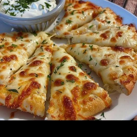 Crispy flatbread or pizza crust topped with garlic butter and melted cheese, sliced into easy-to-share fingers.