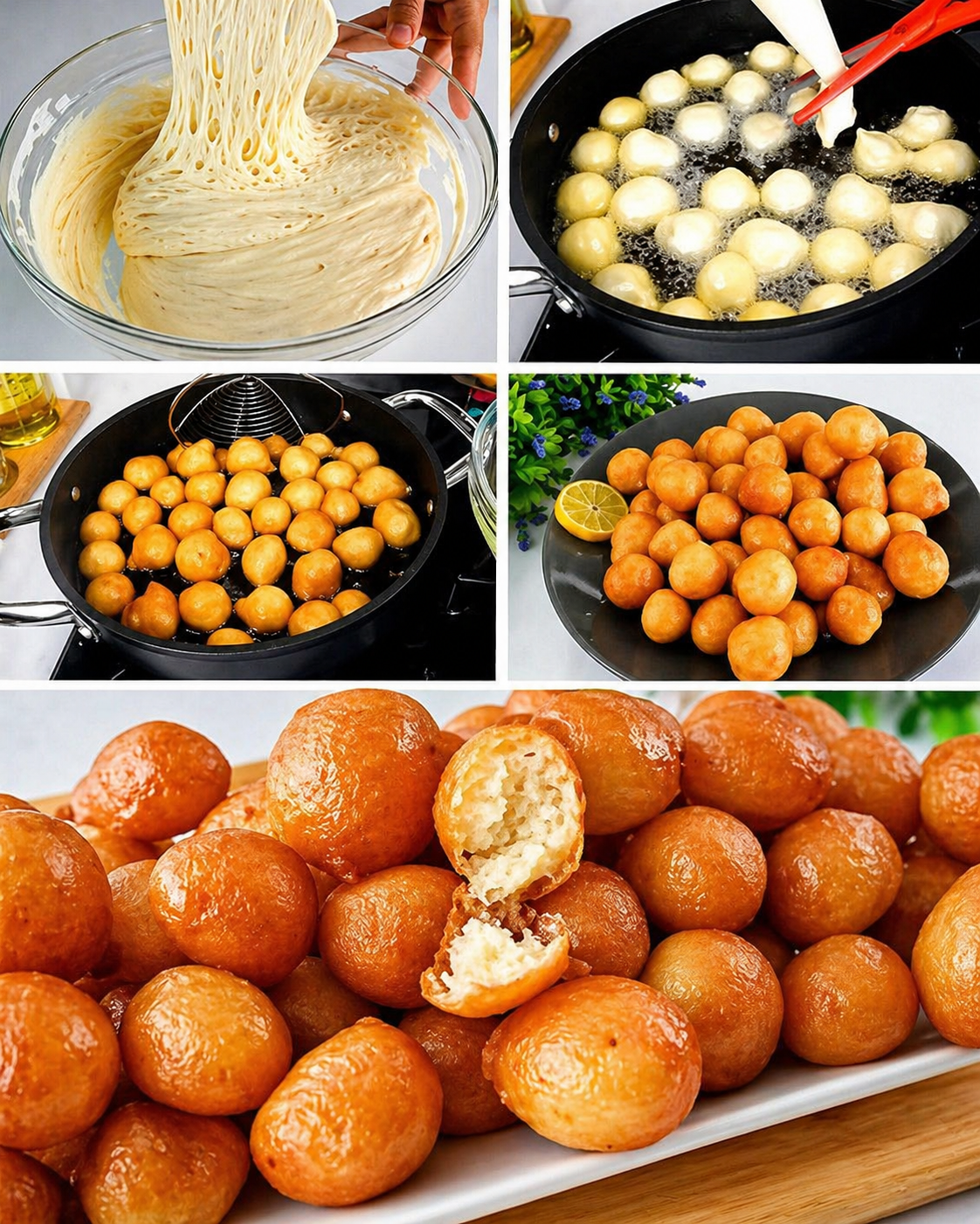 Use oiled hands or a piping bag/spoon to drop small dough balls into the hot oil.