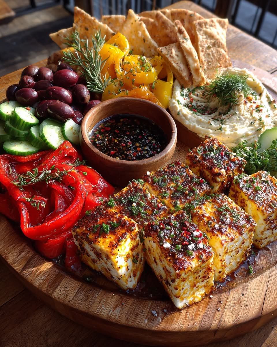 Greek Appetizer Board with Hot Honey Feta, Roasted Red Peppers & Pita Chips