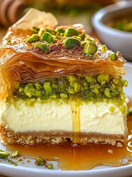 This decadent dessert fuses the classic New York-style cheesecake with the flavors of Middle Eastern baklava. A crisp phyllo and pistachio base meets a smooth cream cheese filling, all drizzled with golden honey syrup. It’s nutty, sweet, and indulgently creamy — perfect for special occasions or a luxurious treat.