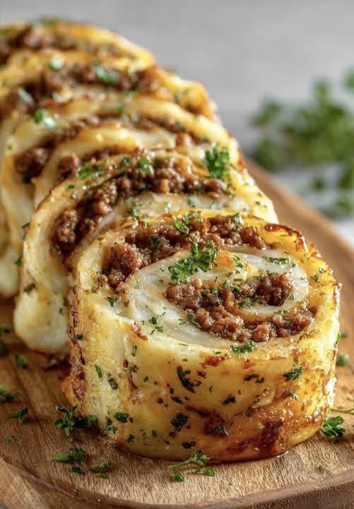 Spread potato mixture evenly on parchment paper into a rectangle (about ½-inch thick). Spread beef filling evenly over the top.