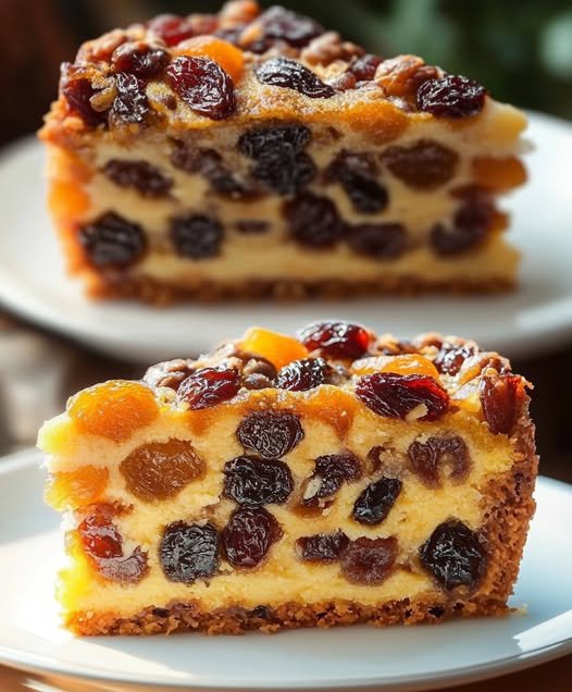 5. Layer the Fruit: Pour half of the cheesecake batter over the cooled crust. Sprinkle a small handful of the soaked raisins and apricots over the batter. Pour the remaining batter on top and smooth it out.