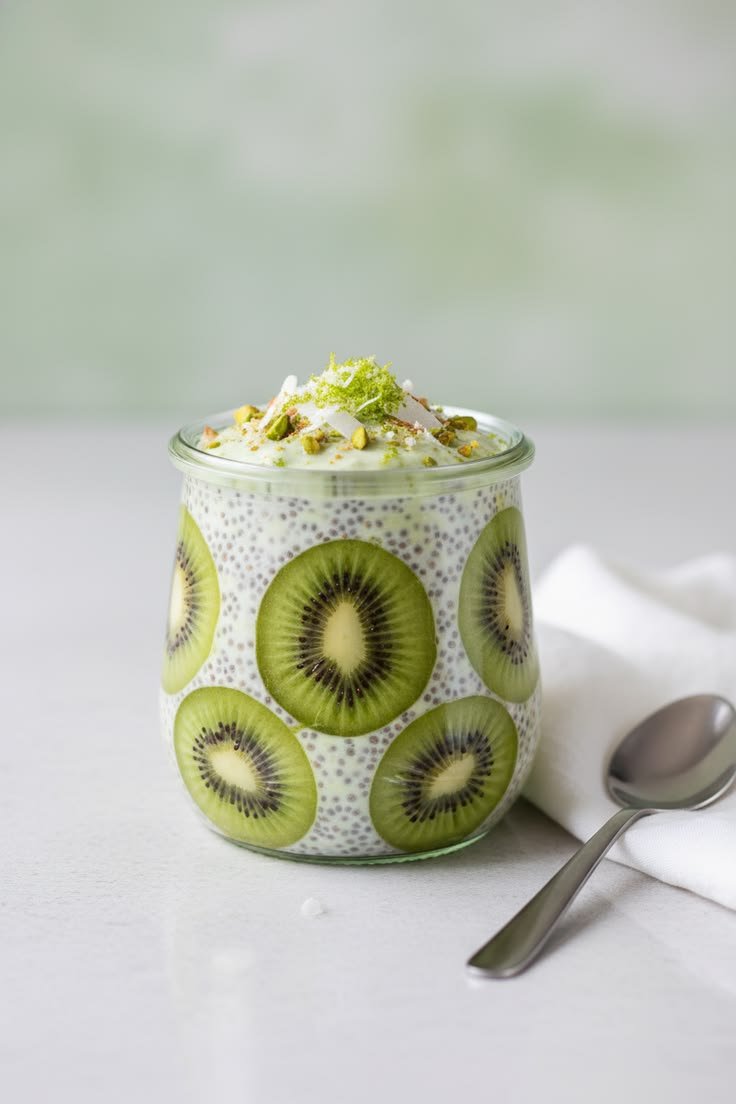 Layer Up: Gently spoon the chilled chia pudding into the center of the jar, being careful not to dislodge the kiwi slices.