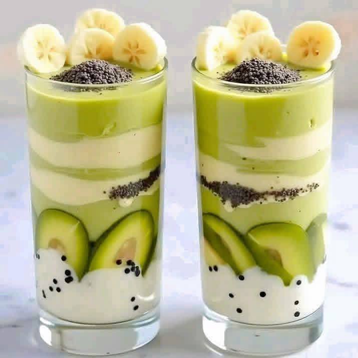 This layered avocado and banana smoothie is a nutrient-dense “Green Goddess” blend that combines healthy fats, antioxidants, and fiber. The specific visual presentation uses a thick yogurt base, decorative avocado slices, and distinct color layers achieved by adding matcha powder.