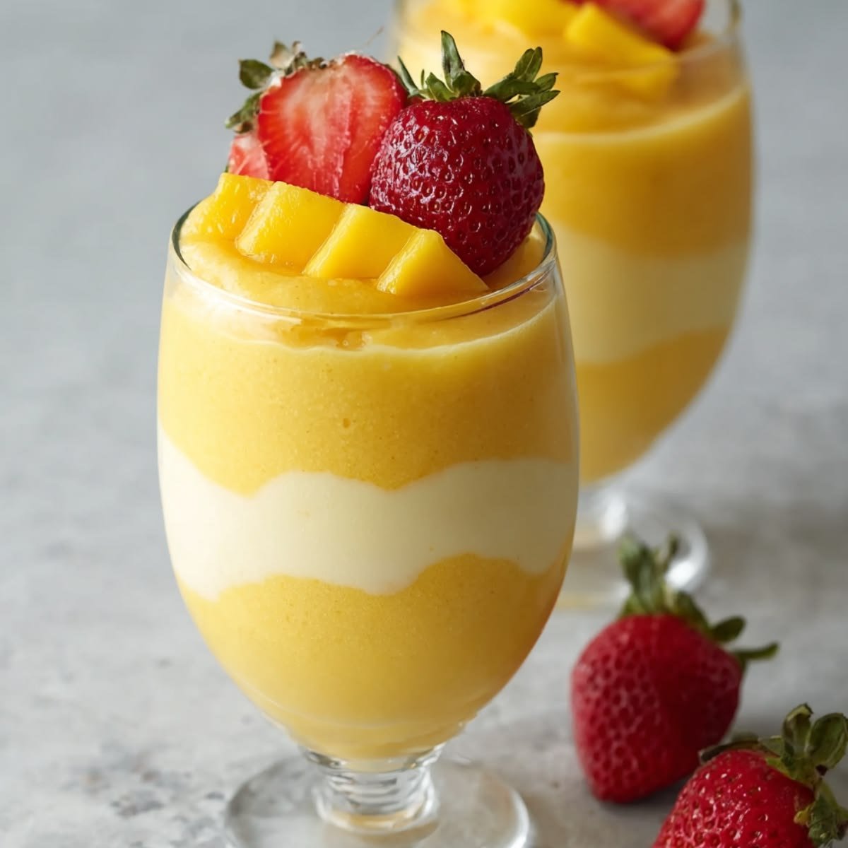 Garnish and Serve: Mirror the image by topping each glass with a few slices of fresh mango and a whole or halved strawberry. Serve immediately with a spoon or a wide straw.