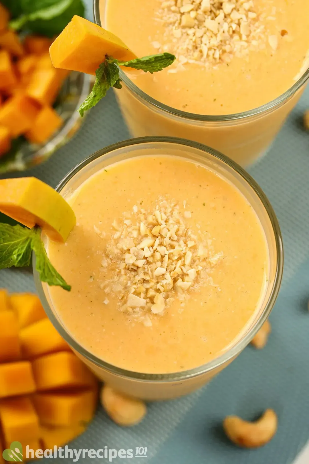 Garnish: Pour into glasses. Top with the chopped cashews and a sprig of fresh mint.
