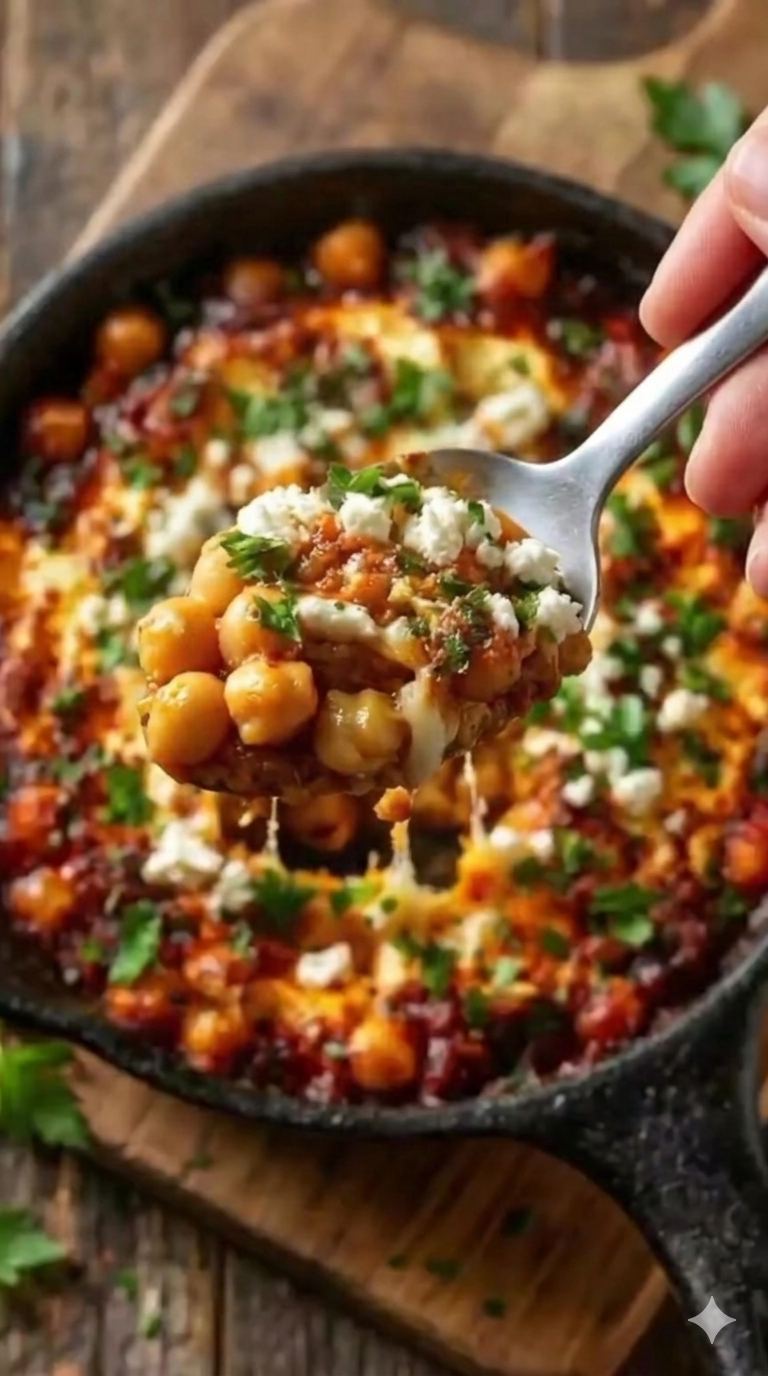 Hearty, saucy, cheesy-but-vegan. Think baked chickpeas in tomato with olives, herbs, and a golden top.