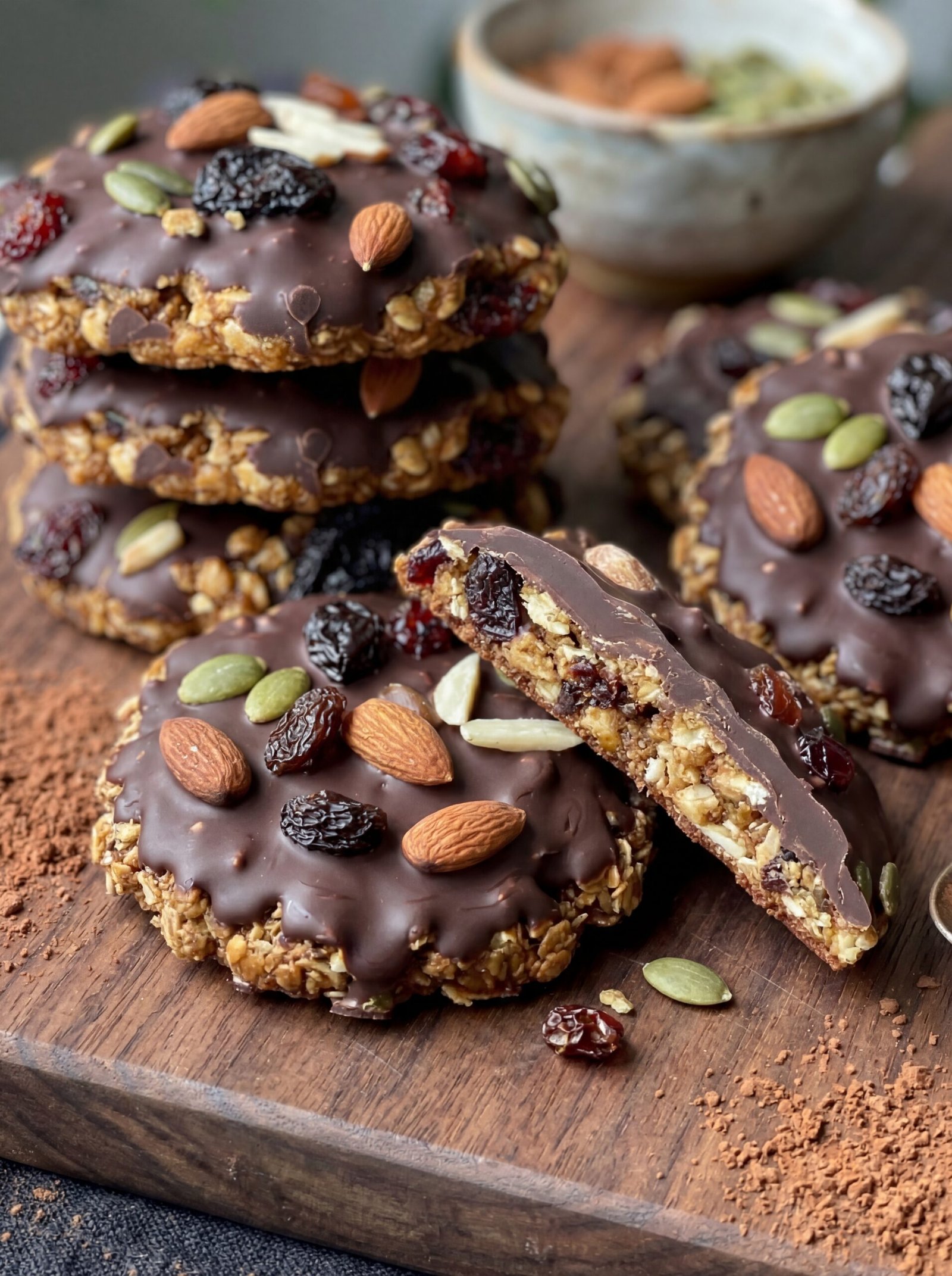 Decorate and Set: While the chocolate is still wet, press a few extra nuts and seeds into the top for that “jeweled” look. Place the cookies in the refrigerator for 20 minutes to allow the chocolate to snap-harden.