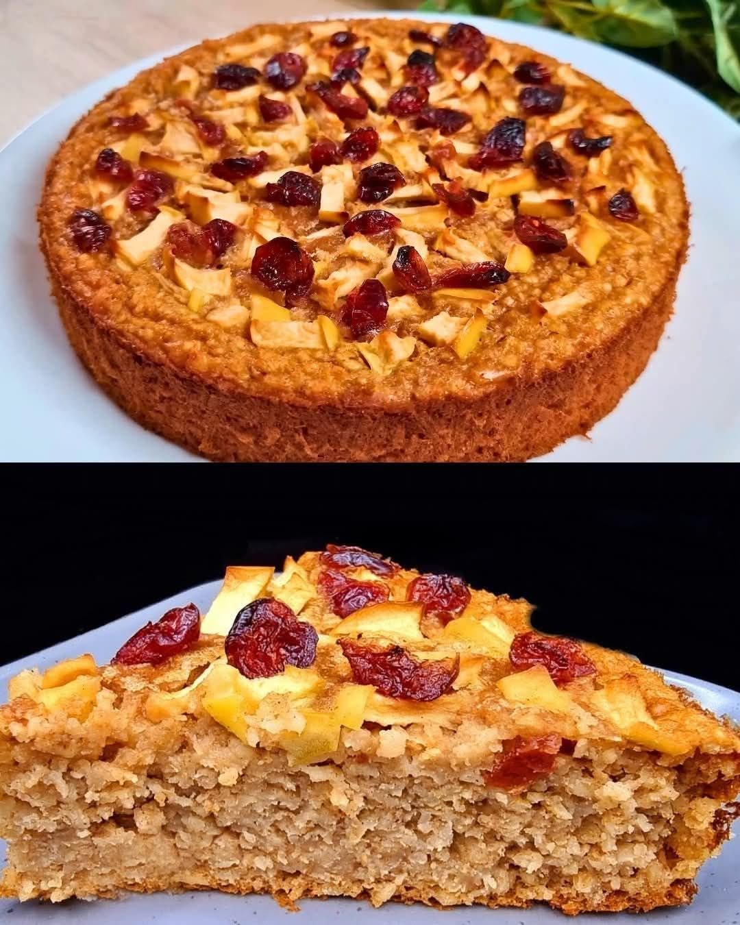 Soft, lightly sweet, and naturally hearty, this oat-based cake is made without flour and filled with apples and cranberries for a fresh, fruity bite.
