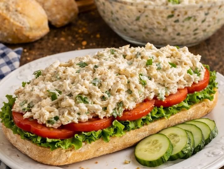 serve a generous scoop on a **toasted baguette or hoagie roll** layered with crisp green leaf lettuce and thick slices of ripe tomato. A side of sliced cucumbers adds a fresh, cool contrast to the rich salad.