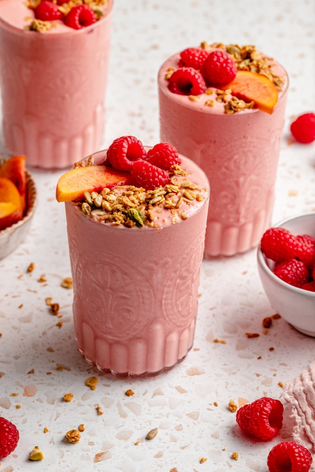 Pro Tip: To get those clean “layers” or a swirl effect, blend the peaches and raspberries separately with half the yogurt each, then pour them into the glass at the same time!