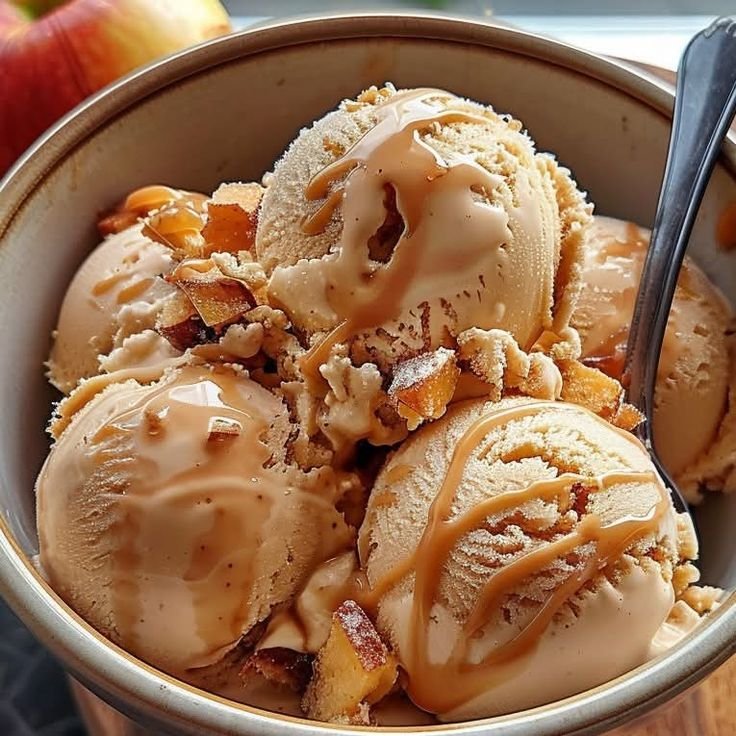1. Prepare the Spiced Apples In a small skillet over medium heat, melt the butter. Add the diced apples, brown sugar, and cinnamon. Sauté for about 5–8 minutes until the apples are soft and caramelized. Set them aside to cool completely. Tip: Mixing warm apples into the cream will melt your ice cream instantly, so patience is key!