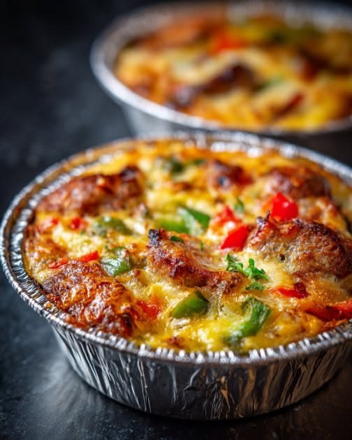Sauté: In a skillet over medium heat, cook the sausage until browned. Add the diced peppers and sauté for 3–4 minutes until slightly softened. Distribute this mixture evenly among the tins.