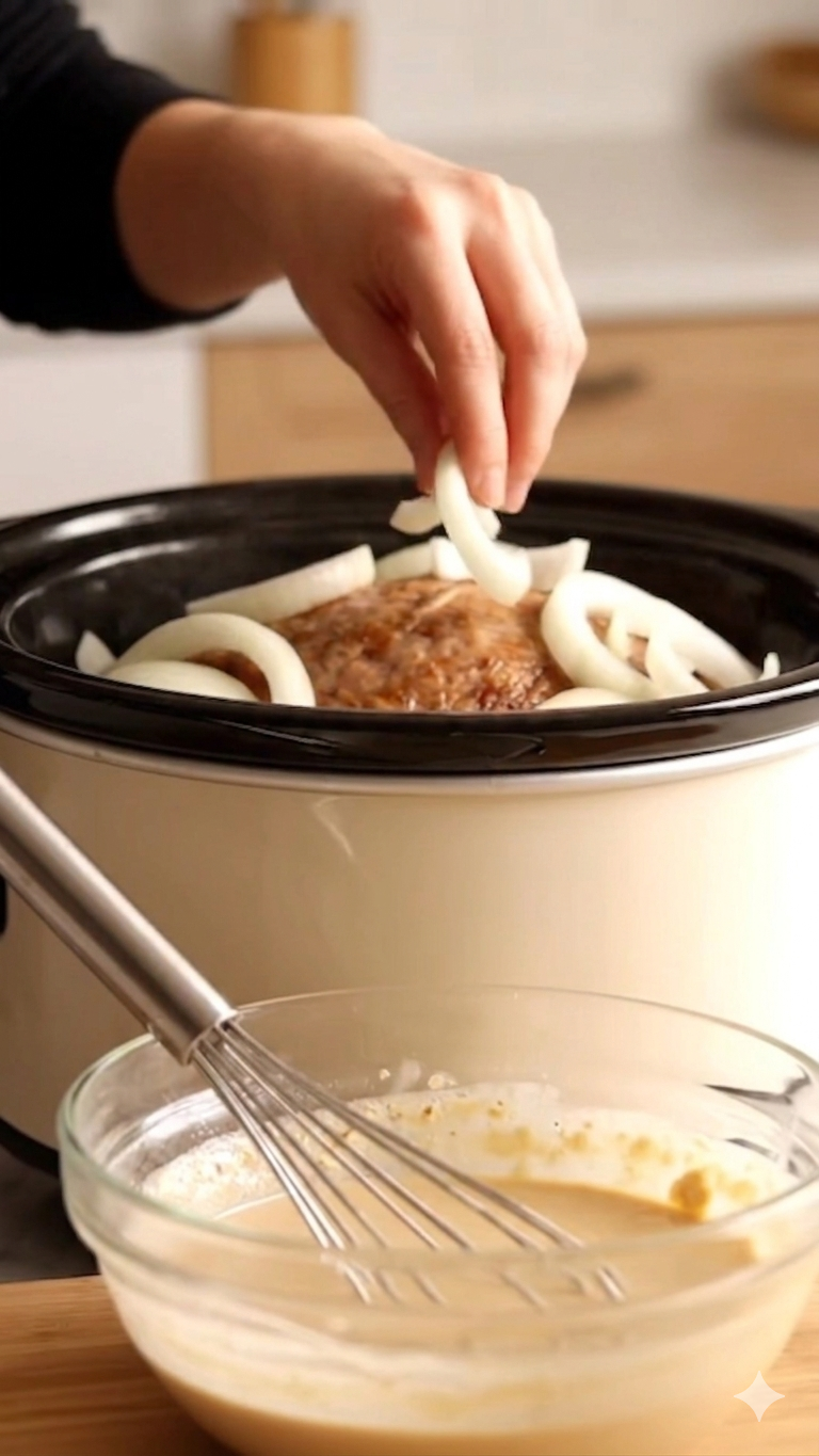 Layer the Slow Cooker: Place half of the sliced onions at the bottom of the slow cooker. Set the pork roast on top of the onion bed, then cover the meat with the remaining onions.